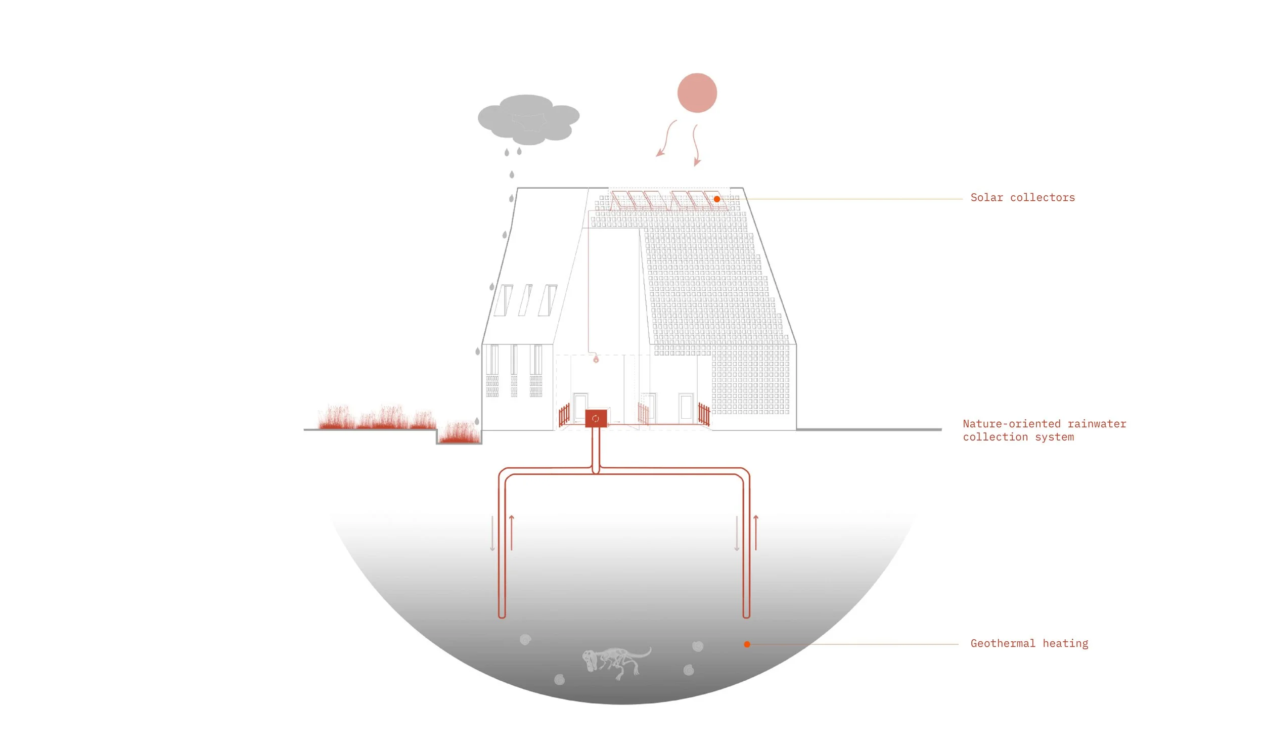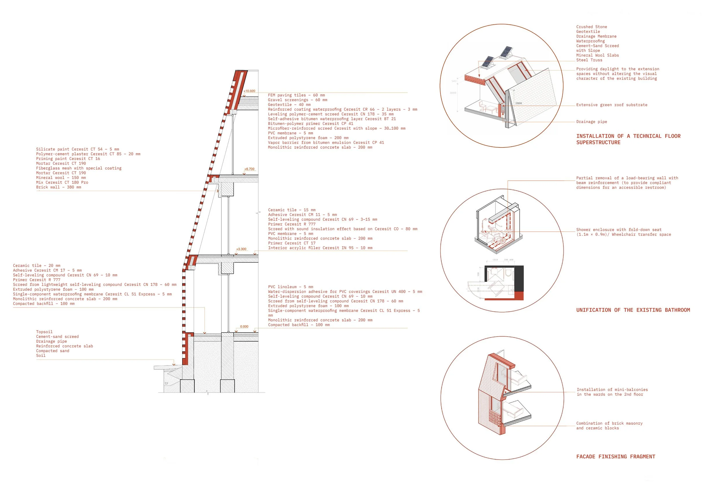 The unifying theme of the complex is the material and color of fired clay, which is present in the tiled roofs of the historic villa and the buildings of a later period, and is proposed for the brick facades of the new parts and for the finishing of multifunctional landscape pathways. The facades of the new structures consist of clinker brick masonry with inserts of ceramic elements measuring 24 × 17.5 × 11.5 cm, which give the buildings a decorative character typical of the estate-type development of Briukhovychi, and also create an exceptional atmosphere when sunlight falls on them.